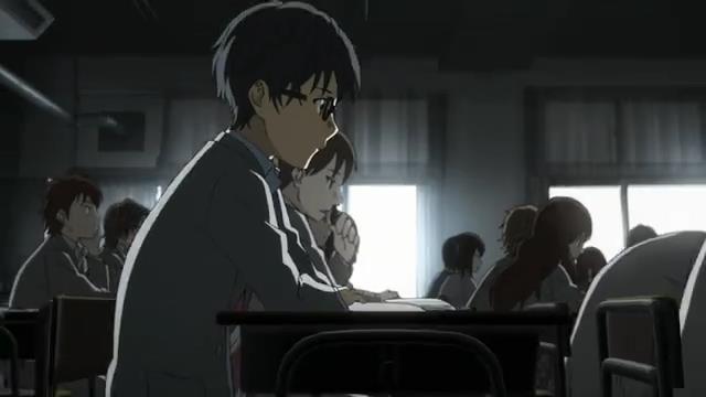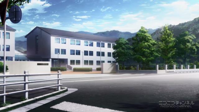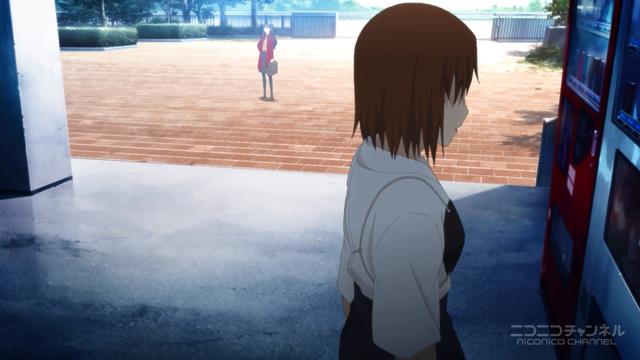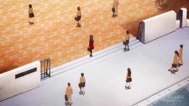 ここから、前述した通り、Aパートでのロングショットが活きてきます。上手いですね。この背景描写は。「ケとハレ」的な対比構造が逆転してるのも面白い。普段は、生徒がたくさん登校している風景が当たり前(=ケ)なのに、この#00では、ハレになってる。それは先に、ハレ(=珍しい)であるはずの「無人の学校」を見せてるから。面白い。