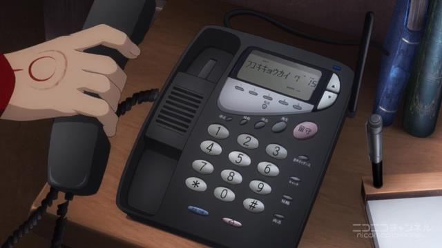 綺礼からの留守電シーン。ちょっと面白いものになっている。当然、ここでは、凛の右横に固定電話がある。そして、凛が右に向き直し、留守電の再生を押す。そうして、留守電にポン寄りするが、これが面白い。ここまでのシーンはほぼ全て客観的な視点であったが、凛の目線で描くことにより、ここで初めて純粋な凛主観になる。 そうして、物語の「承」を告げる。